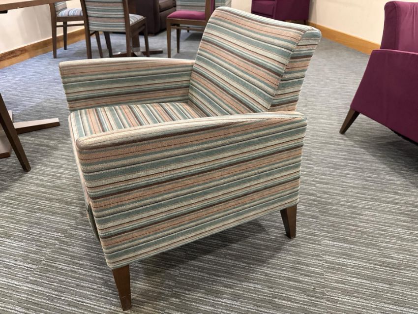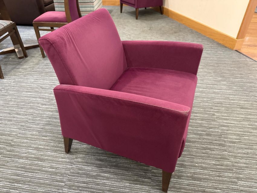 Made up of 2 x Patterned and 2 x Plum coloured fabric with dark wood legs