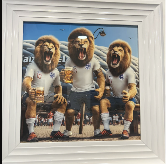 Three lions Drinking Beer White Frame